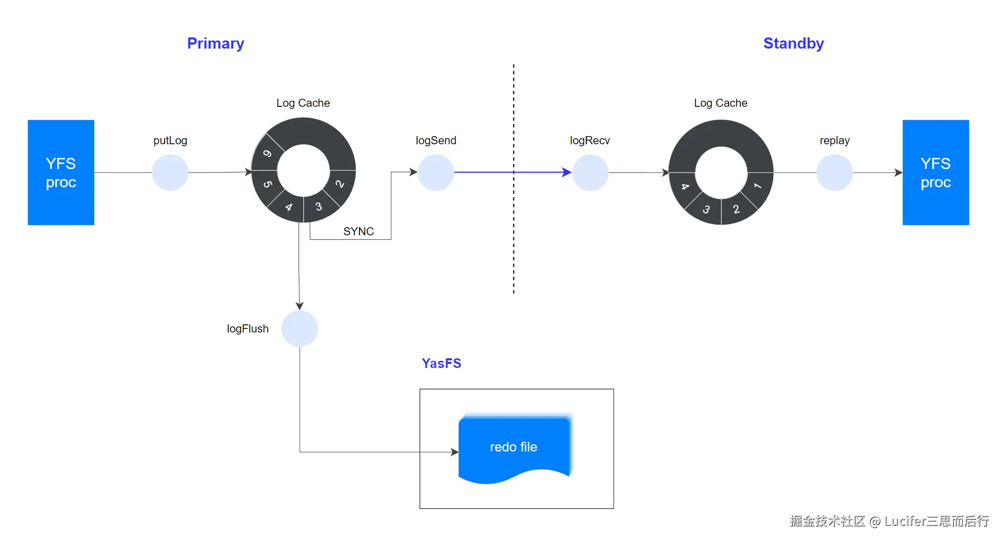 YFS 集群至少包含 1 个主实例(Primary)和若干备实例(Standby)。主实例负责处理所有元数据变更,同时将产生对应的 redo log,插入 Log Cache。