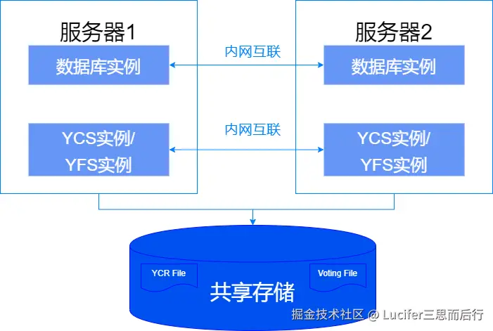 YCS 要求在共享存储上划分至少三块盘,是用作配置的 YCR File 和 Voting File,所有服务器上的 YCS 实例和数据库实例均可读写这三块盘。