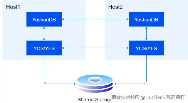 YashanDB 在共享集群部署形态下,在硬件上需依赖共享存储,在软件上也引入新的基础设施,包括崖山集群服务 YCS 和崖山文件系统 YFS,分别提供集群管理和并行文件服务的能力。