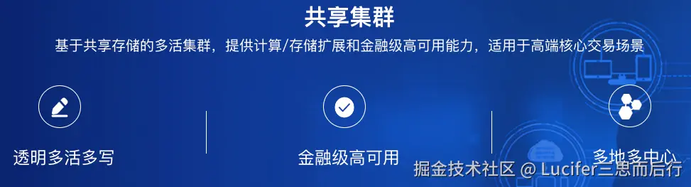 - 共享集群是一个单库多实例的多活数据库系统,用户连接任意实例都可以访问同一个数据库,多个数据库实例可以并发读写同一份数据,且保证实例之间读写的强一致性,具备高可用、高扩展、高性能等特性。