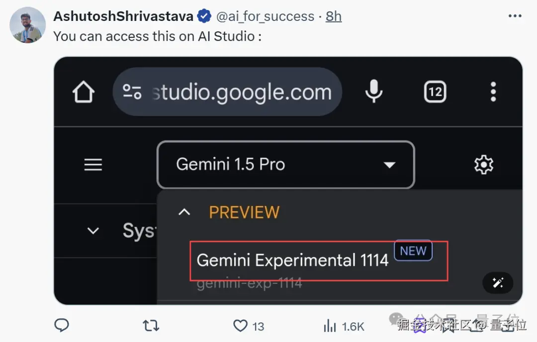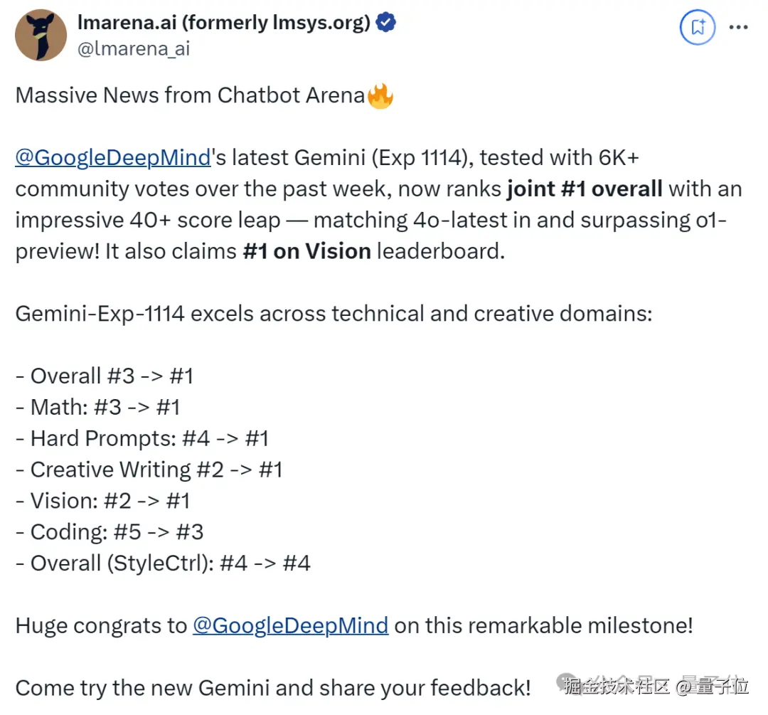 新模型名为 Gemini(Exp 1114),成绩一公布,连 CEO 皮猜也亲自飞奔来站台。