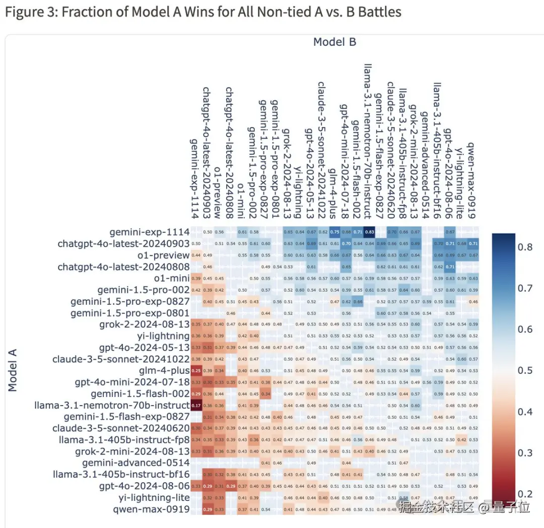整体胜率热图显示,Gemini(Exp 1114)对战 4o-latest 胜率为 50%,对战 o1-preview 胜率为 56%,对战 Claude-3.5-Sonnet 胜率为 62%。