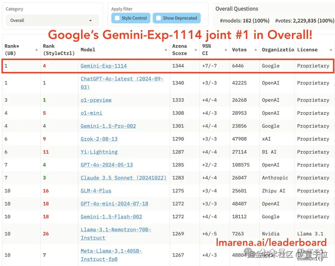 从总榜来看,谷歌新模型 Gemini(Exp 1114)分数直涨 40+,挤下了之前一直霸榜的 OpenAI 模型(包括 o1-preview、GPT-4o)。