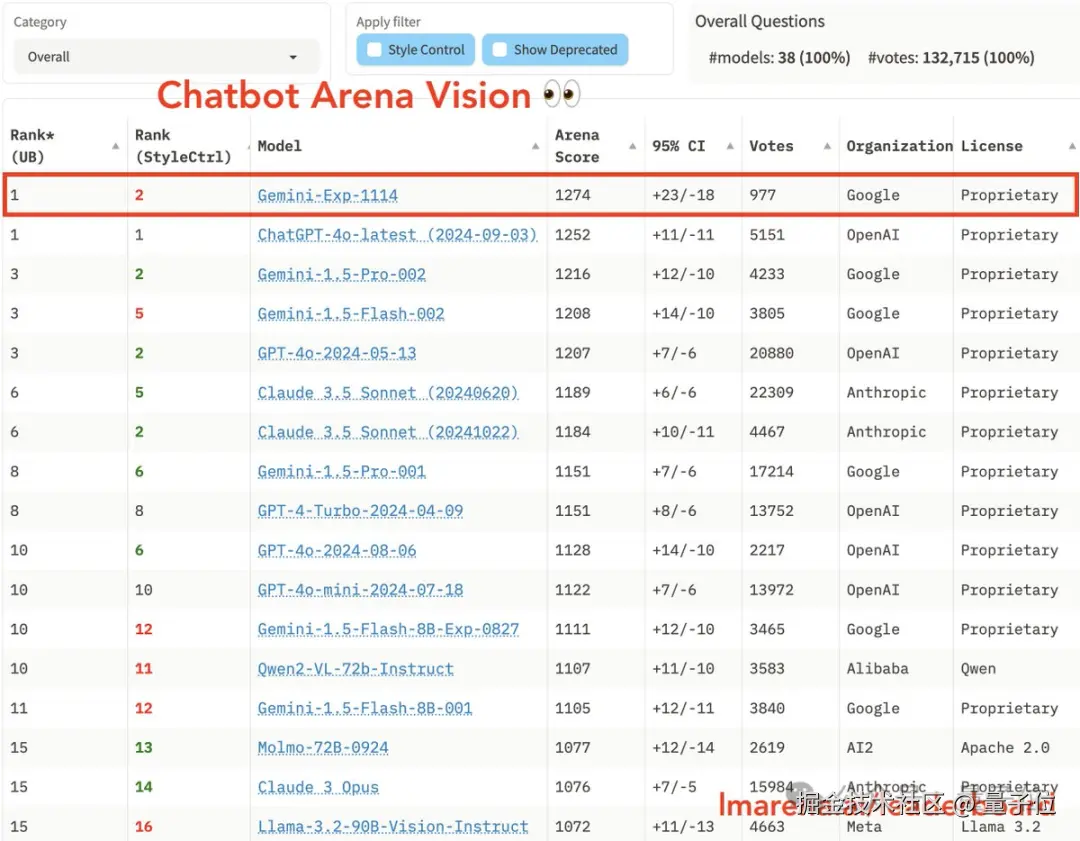 不过也有意外之喜,Gemini-Exp-1114 这一次在视觉能力上拿下第一,超越了 GPT-4o。