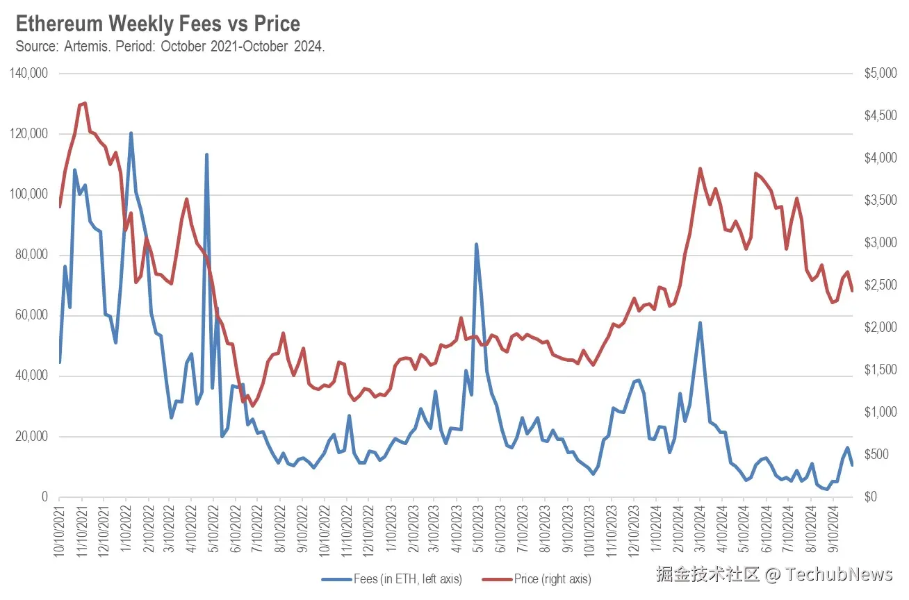 但随着用于执行的 L2,甚至像 Celestia 这样的替代数据可用性(DA)层的推出和发展,以太坊的费用已经下降。通过放弃核心创收服务,以太坊的费用和收入都有所下降。这对 ETH 的价格产生了很大的影响。