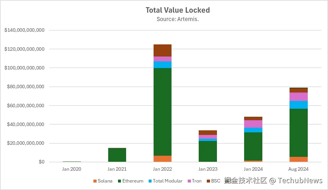 如果从 TVL 市场份额的角度来考虑,当以太坊于 2015 年推出时,它拥有 100% 的市场份额。尽管有数以百计的 L1 竞争者,但以太坊及其模块化生态至今仍保持着约 75% 的市场份额。