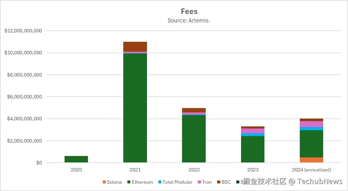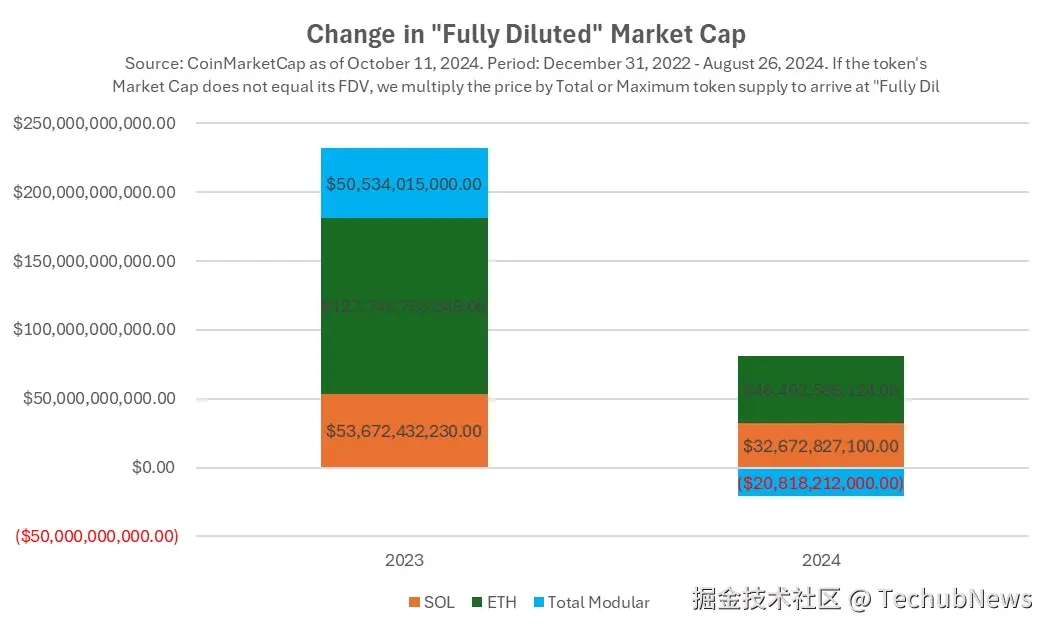 - 如果把以太坊及其模块化生态的市值加在一起看,情况会发生变化。2023 年,以太坊模块化基础设施代币产生的价值与整个 Solana 的价值差不多,都是 500 亿美元。但在 2024 年,这些代币的整体表现不如 Solana。此外,这些代币的收益主要归团队和早期投资者所有,而非 ETH 代币持有者。