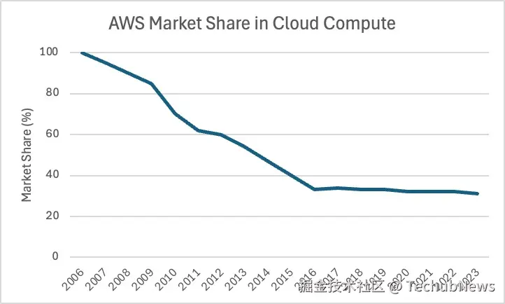 然而,就市场份额来说,随着时间的推移,AWS 的市场份额逐渐被其他云计算提供商夺走,微软 Azure 和谷歌云等竞争对手每年都在稳步扩大市场占比,AWS 的市场占比已从最初的 100% 下降到了现在的 35% 左右。