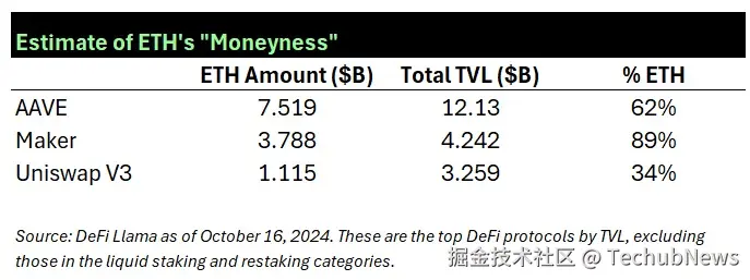 但是,ETH 是否真的受益于「以太坊生态」的主导地位吗?或者说,以太坊及其模块化部分正在蓬勃发展,但并没有将 ETH 本身作为一种资产?事实证明,ETH 是更广泛的以太坊生态中无处不在的一部分。当以太坊扩展到 L2 时,ETH 也是如此。大多数 L2 使用 ETH 支付 gas,而且大多数 L2 TVL 中的 ETH 至少是其他代币的 10 倍。观察下表,就可以了解以太坊生态中三个最大的 DeFi 应用在其主网和 L2 实例中 ETH 资产的主导地位。
