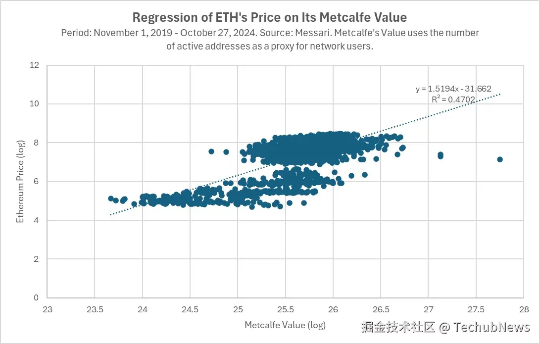 在 Web3 中,协议的价值取决于其平台上的整体活动量,取决于拥有最活跃的构建者和用户生态。下面是我们对比特币、以太坊和 Solana 的代币价格与梅特卡夫值(衡量网络中用户数量的指标)之间关系的分析。在所有情况下,代币价格都与梅特卡夫价值高度相关,这种关系持续了数年,而就比特币而言,这一关系已经持续了十多年。