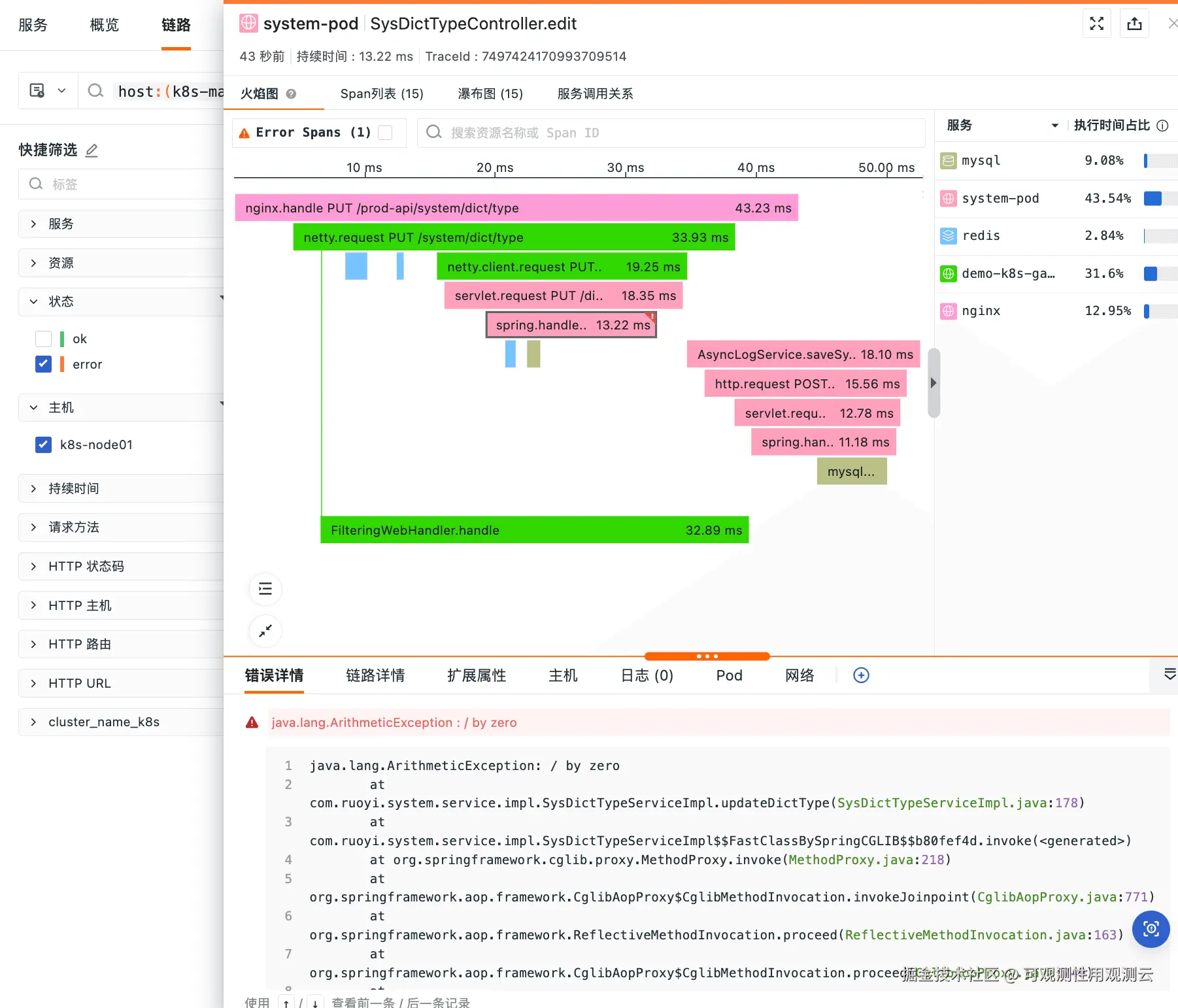 在业务访问过程中产生的错误,我们同样可以在观测云的 APM(应用性能监控)页面上实时查看。这使得我们能够及时发现并处理系统中的问题,确保业务的顺畅运行。
