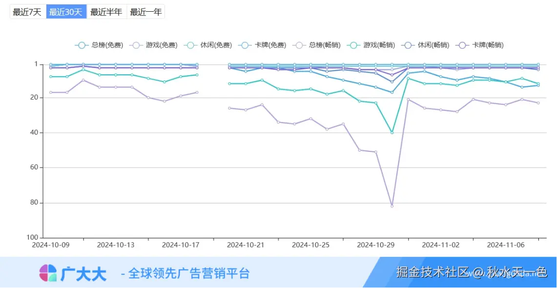 其实早在9月26日,游戏就在新西兰开启试运行,首日便登顶iOS游戏免费榜,同时冲上畅销榜第15名,从广大大—App分析模块可以看到,其在10月30日数据开始呈现一个大的下降趋势,可见正式服的上线对其有着一定的冲击力,也有可能是前来抢先体验的玩家跑路回去正式服了。