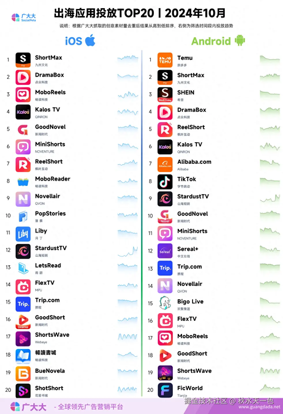 毫无疑问,10月投放头部阵营依然是以出海短剧为主,九州文化【ShortMax】和拼多多的【Temu】分别蝉联iOS和Android端的投放冠军;山海短剧的出海产品【StardustTV】突然爆升,进入头部席位;携程海外版【Trip.com】稳中小升,位列双端投放中流;榜单之外,畅读旗下又一款出海短剧平台【MoboShort】投放力度加大,走到台前。