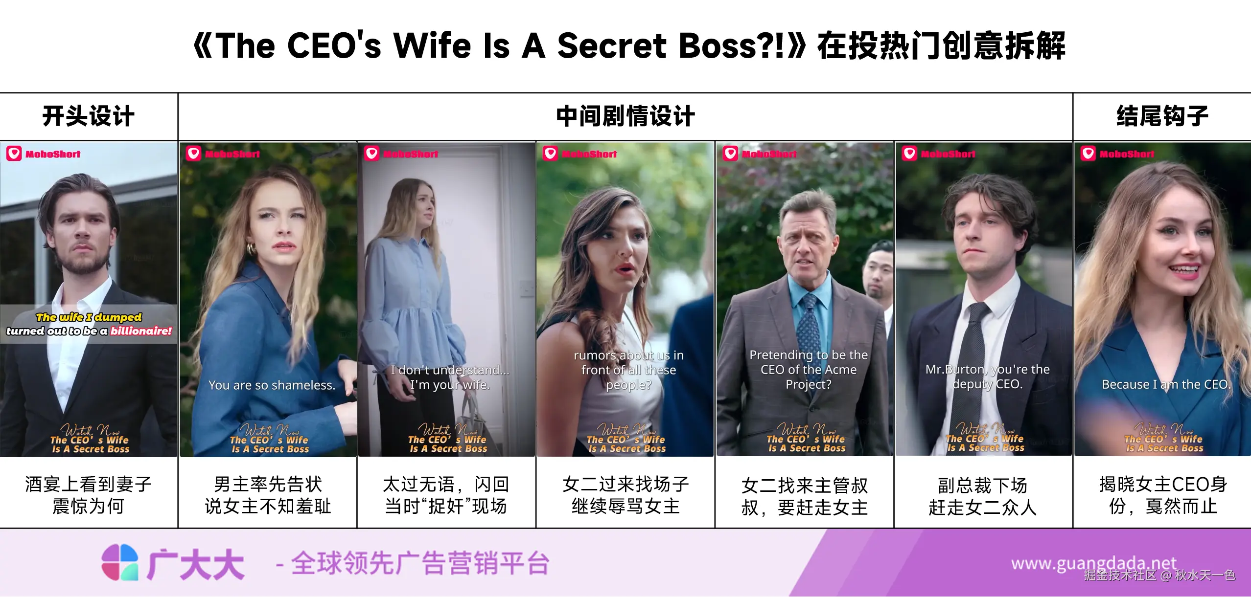 近期热投剧集解析:看多了男霸总题材的短剧之后,女频也有自己的女霸总短剧了。出轨、怀孕、流产等抓马类剧情一个不少,男主和女主之间的误会就是不要通过好好交流解开,于是便有了下面这个经典的素材。男主看到女主分手后恢复太快而悲伤,反而用“不知羞耻”的侮辱言语来指控女主吸引注意,女二和男主妈的狐假虎威也在最后身份揭晓后荡然无存,总的来说也是大段铺陈侮辱女主的剧情,最后反转完成爽感释放。