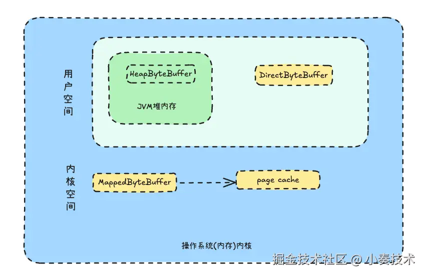 MappedByteBuffer也是在操作系统内存中,不同于DirectByteBuffer的是MappedByteBuffer是直接映射到pageCache。所以算是直接写内核态的pageCache,不像DirectByteBuffer需要拷贝到pageCache,还要进行上下文切换