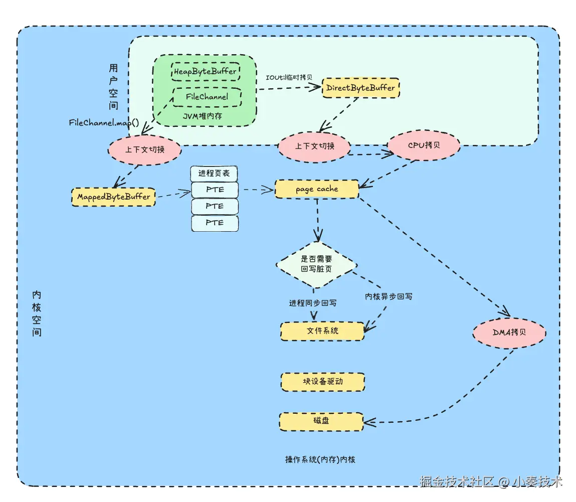 DirectByteBuffer拷贝到pageCache中 pageCache再通过DMA拷贝到磁盘中,再次进行数据拷贝- 然后再次上下文切换回到用户空间