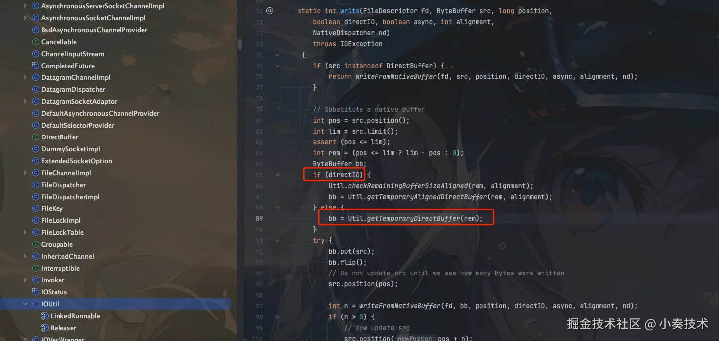 DirectByteBuffer相比HeapByteBuffer流程相同,主要是少了JVM堆内存拷贝到临时的堆外内存DirectByteBuffer这一步