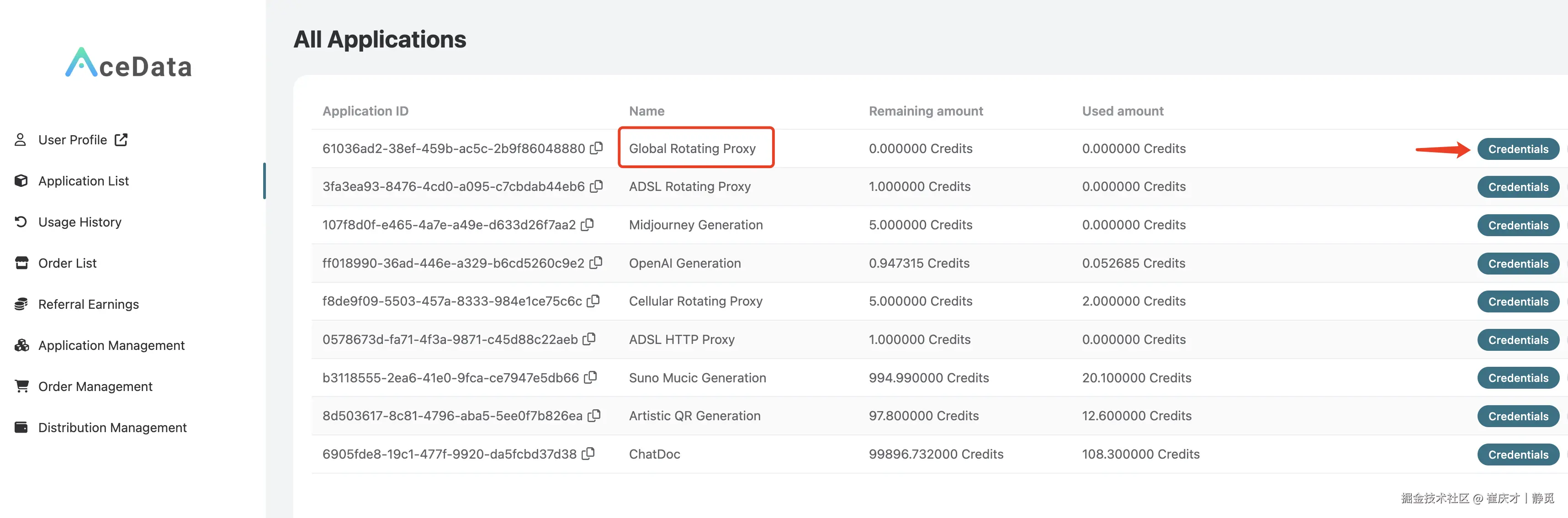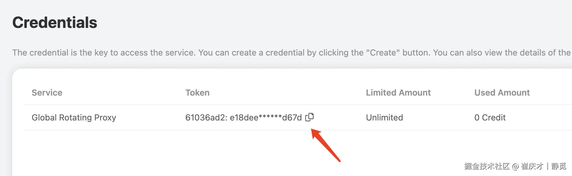 点击 「Credentials」,即可查看使用全球代理服务的用户名及密码,以冒号分隔,其中用户名是 8 位,密码是 32 位,如图所示: