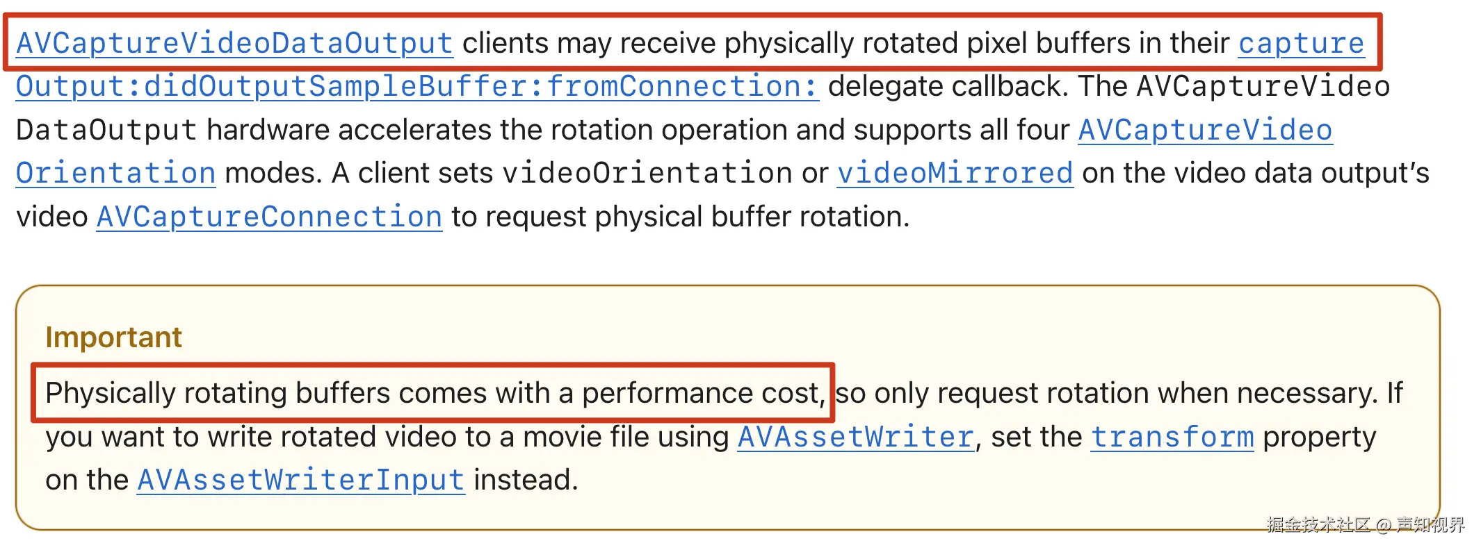 通过 AVCaptureConnection 可以让系统帮忙把旋转 90 度的操作在采集阶段做掉,但会引入性能损耗,因此推荐放在后续环节。具体细节可参考 Apple 官方文档 developer.apple.com/documentati…