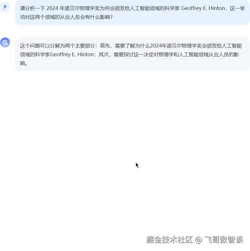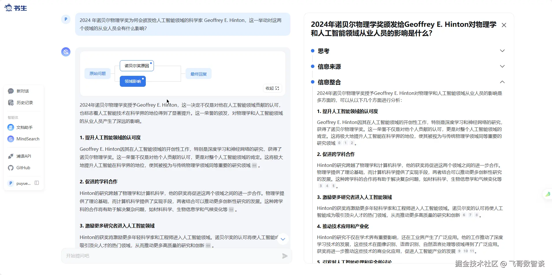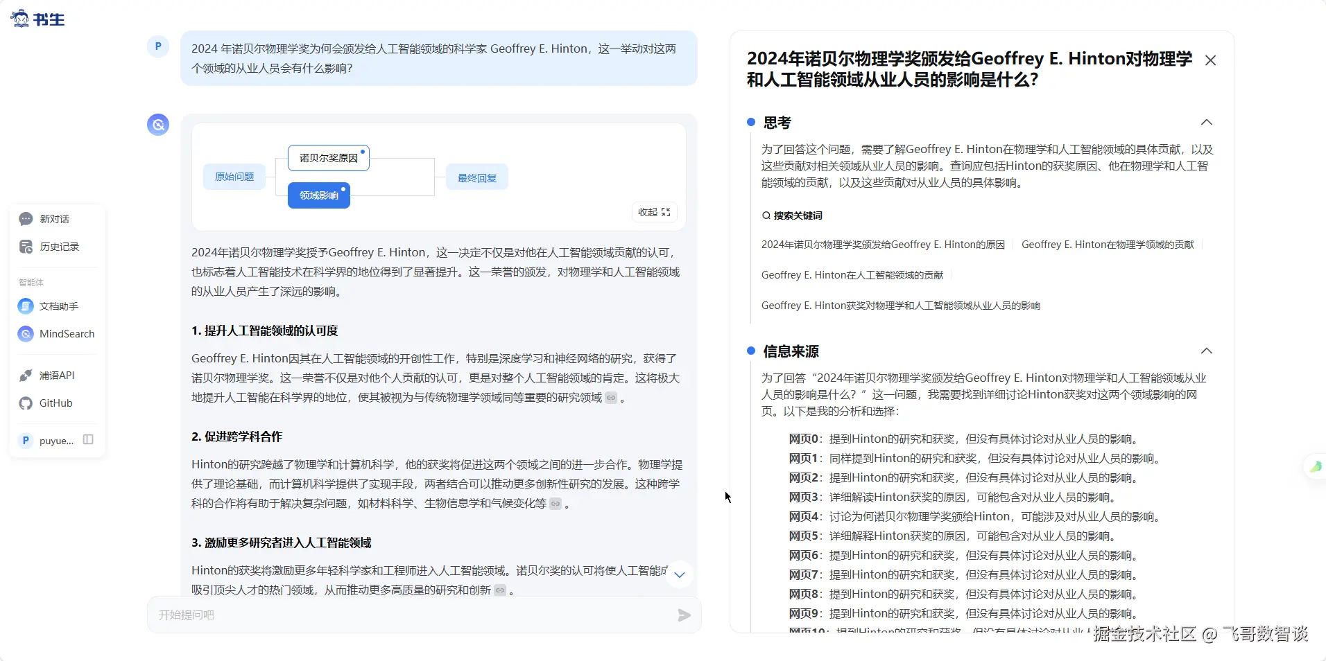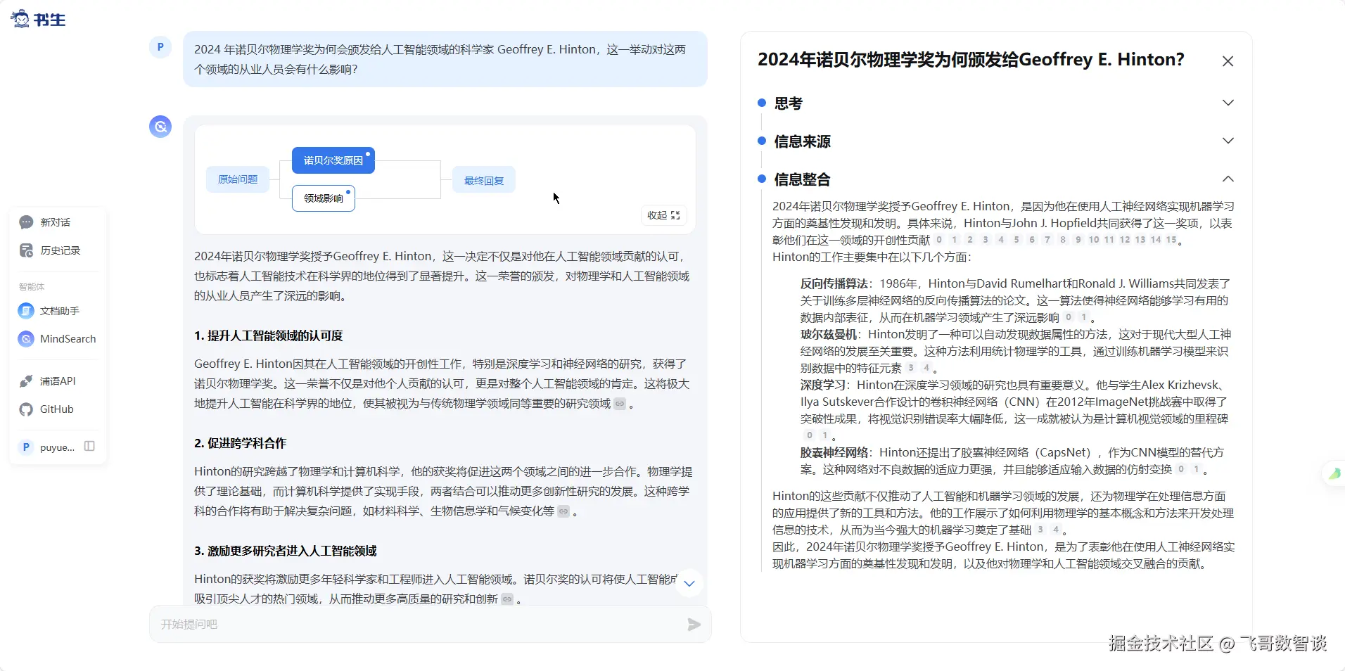 MindSearch界面还是非常简洁的,直接录入我的问题“2024 年诺贝尔物理学奖为何会颁发给人工智能领域的科学家 Geoffrey E. Hinton,这一举动对这两个领域的从业人员会有什么影响?”,可以看到有很明显的问题解析过程。