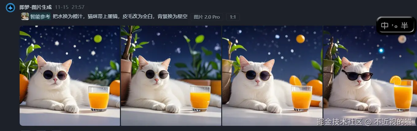 下面我们来高端点的,把水换为橙汁,猫咪带上墨镜,皮毛改为全白,背景换为星空: