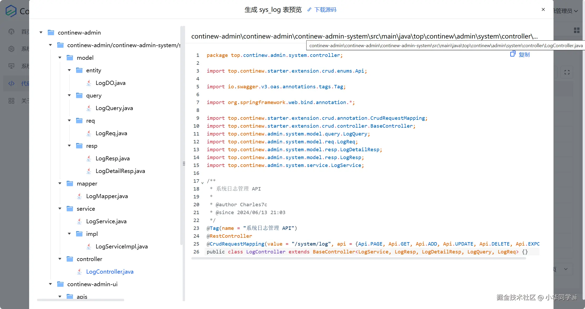 为了提高开发效率,ContiNew/continew-admin内置了代码生成器。通过简单的配置,开发者可以快速生成前后端代码,实现快速开发。