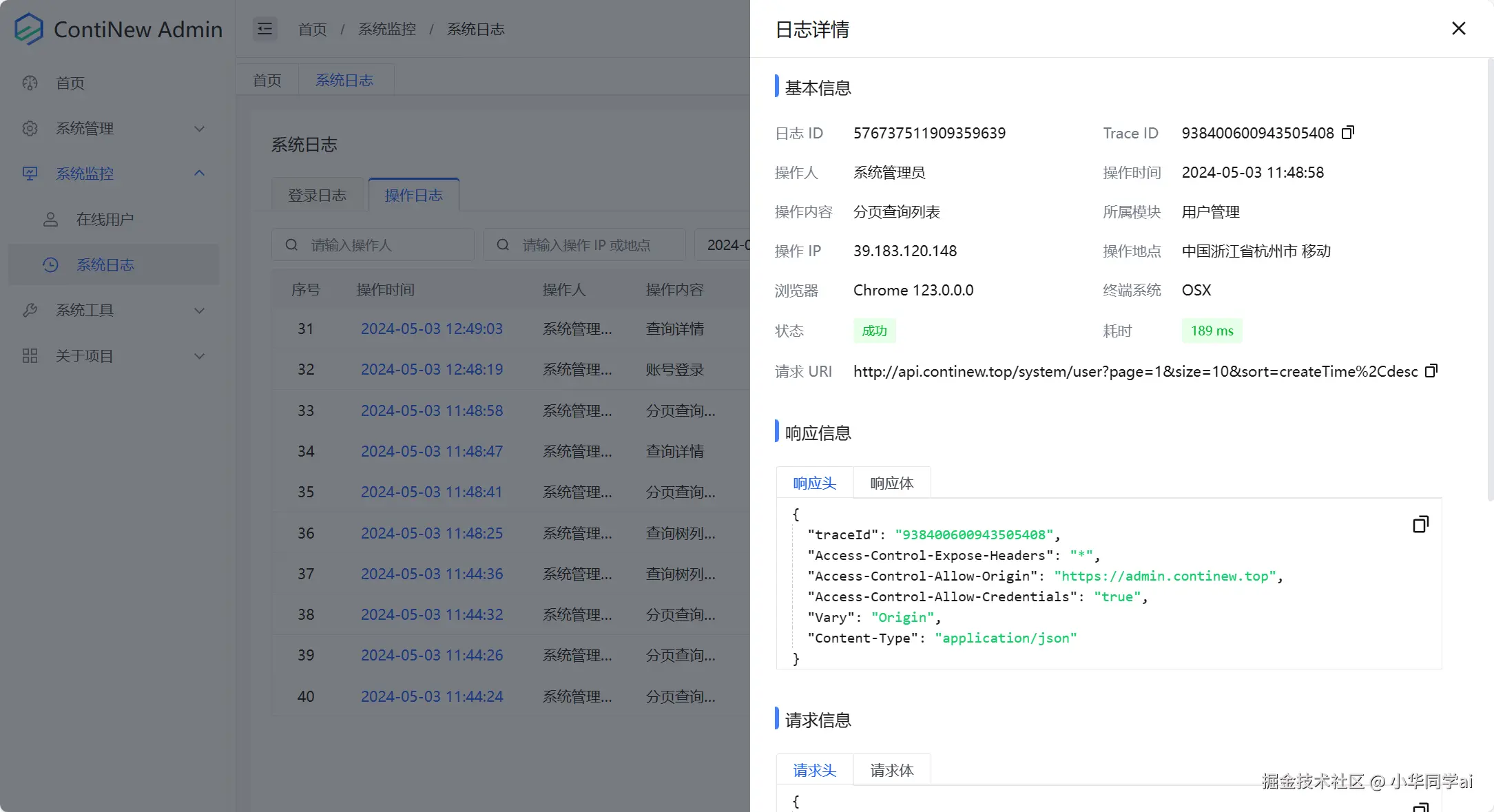 日志管理功能可以帮助管理员实时监控系统的运行状态,及时发现问题并进行处理。ContiNew/continew-admin提供了详细的日志记录,包括操作日志、异常日志等。