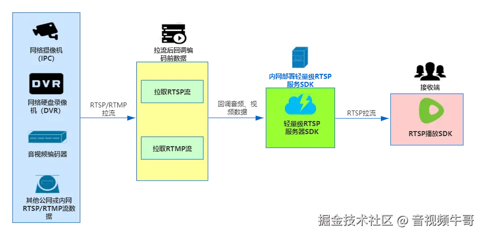 今天要探讨的是,如何把外部的RTSP|RTMP流,注入到轻量级RTSP服务?实际上,这块对大牛直播SDK来说,算不上新模块或技术,因为前些年已经实现了,对应的是我们的内网RTSP网关模块。