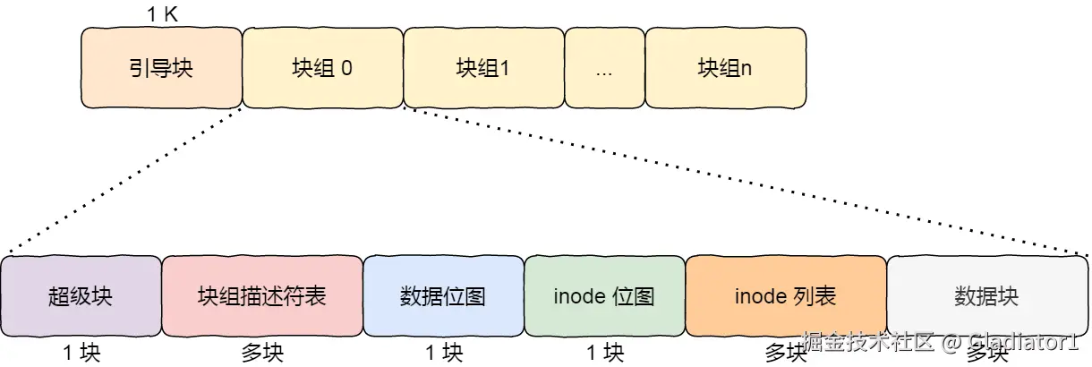 在 Linux 文件系统,把这个结构称为一个块组,那么有 N 多的块组,就能够表示 N 大的文件。