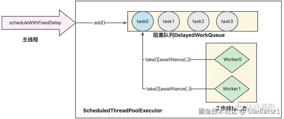 于是 JDK 1.5 之后,开发者就抛弃了 Timer,开始使用ScheduledThreadPoolExecutor。先通过下面这张图感受下。