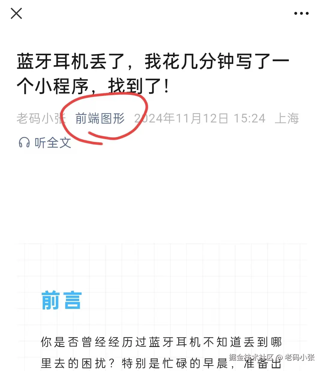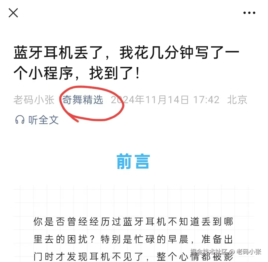 讲真,我写文章的初衷很简单,就想分享一下自己的技术小心得。比如那篇蓝牙耳机丢了,我写了个小程序找到的文章,逻辑清晰、代码贴心,收获了不少点赞、转发,甚至还有人在后台问我“代码能不能分享一下”,在此也特别感谢铁子们。