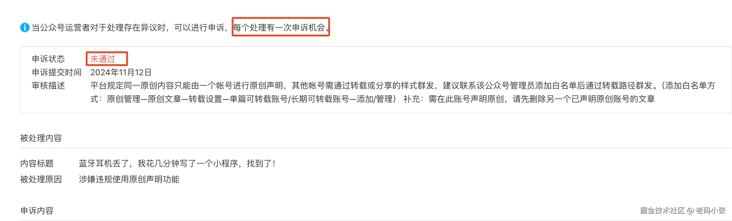 好吧,我举报、申诉,想着“证据确凿,应该很快就能解决吧?”结果,微信公众号第一次申诉居然直接驳回了,还告诉我:只有一次申诉机会!