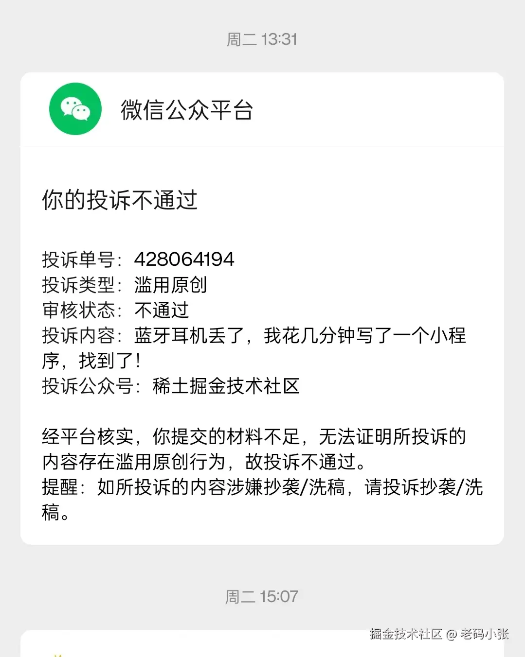 事情的起因是,2024.11.11,我发现文章被微信公众号上掘金社区转载,点击一看,标题、正文、图片,连标点符号都一模一样。最气的是,人家还理直气壮地标了原创,我有一种不祥的预感,果然,我漏掉的一条消息中发现了这样 一条!