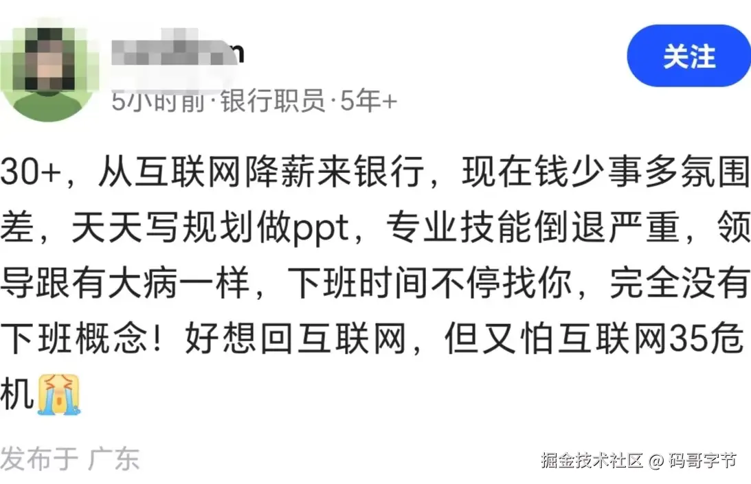今天,我们就来聊一聊,一位 30+程序员从互联网降薪跳槽到银行后的亲身体验,他是如何从“代码海”跳进“政治江湖”的,以及这一路的得与失。