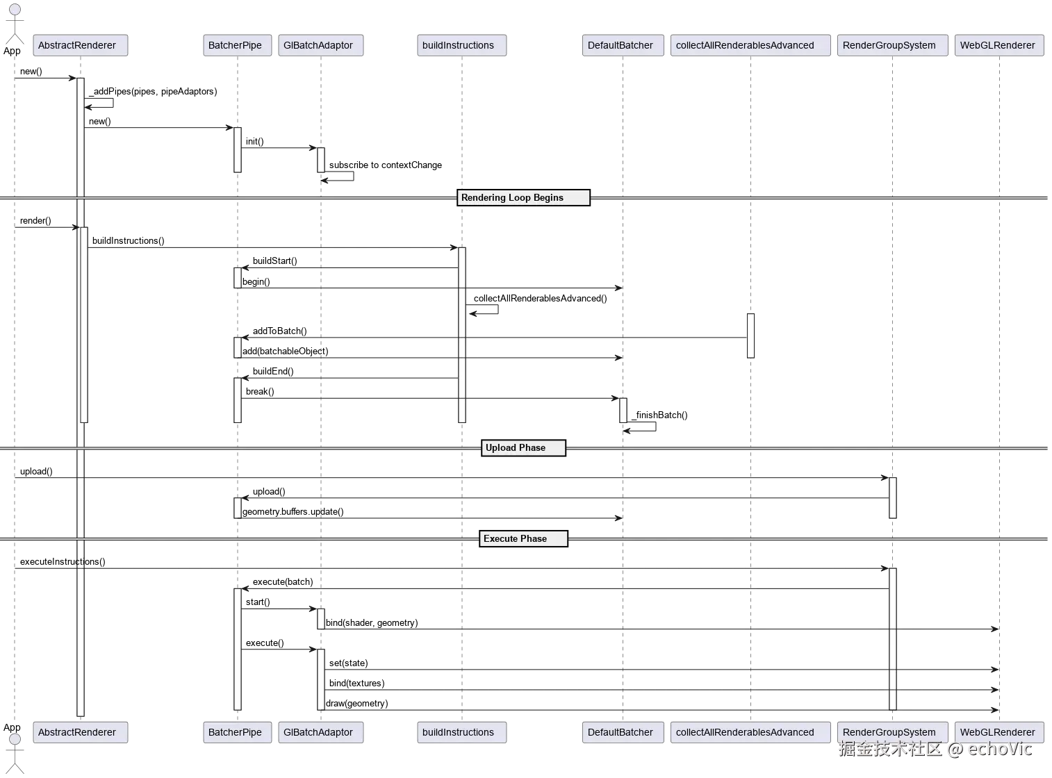 一旦准备好所有资源,RenderGroupSystem 会调用 executeInstructions 来执行所有渲染指令。对于批处理指令,BatcherPipe 的 execute 方法会被调用,执行批处理渲染。