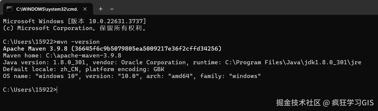 随后,在其中输入mvn -version,如果出现如下图所示的界面,则表示电脑中已经有Maven环境了,即前述配置正确。