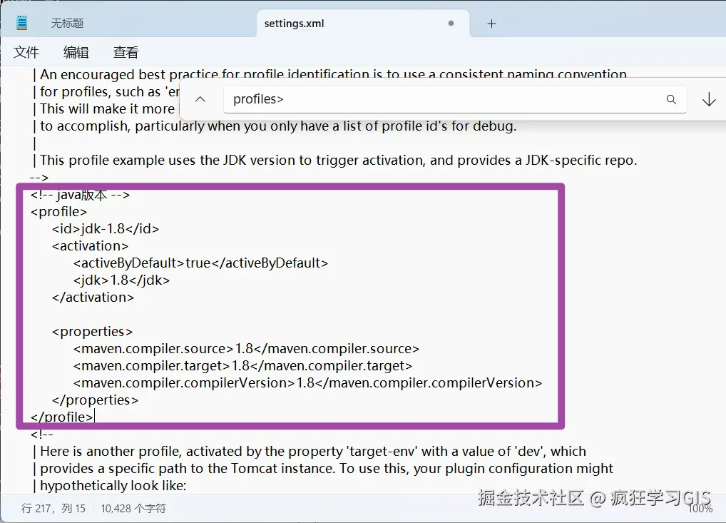 最后,我们再搜索profiles>,并找到如下图所示的位置。