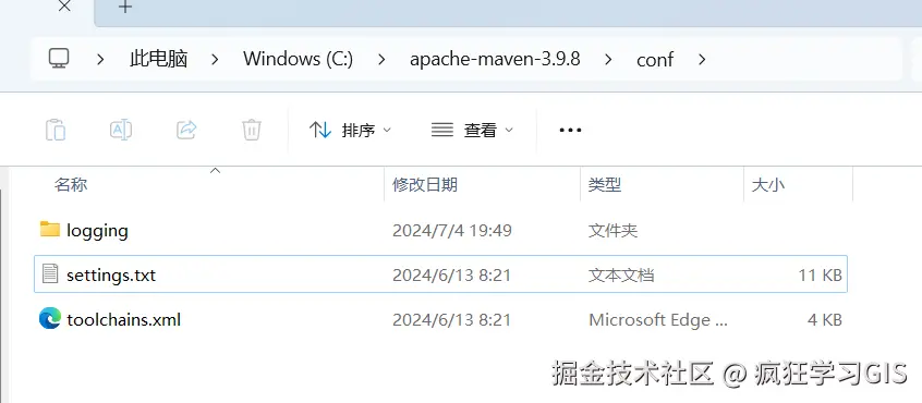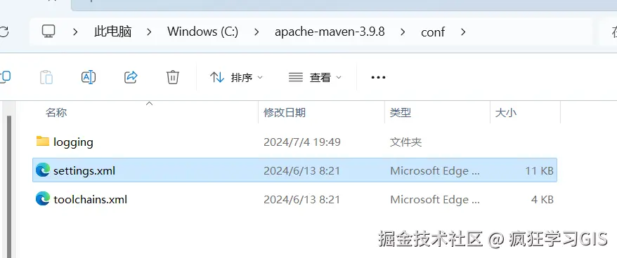 随后,找到conf文件夹中的settings.xml文件,需要对其加以编辑;如下图所示。