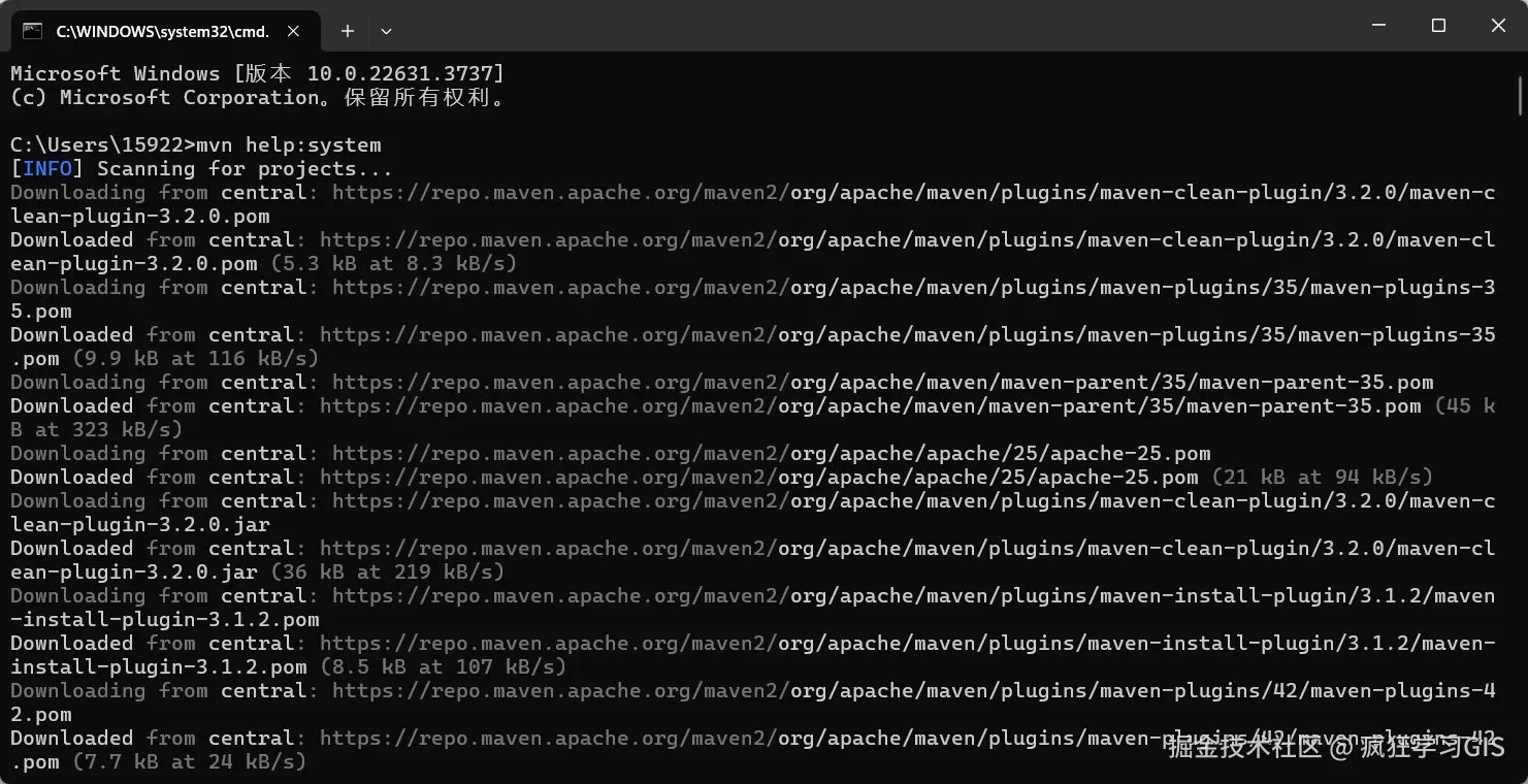 接下来,依然是通过本文前述方法打开命令行,然后输入mvn help:system。如果出现如下图所示的界面,则表示Maven已经安装正确。