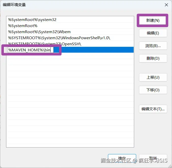 随后,新建1个变量,设置为%MAVEN_HOME%\bin,具体如下图所示。