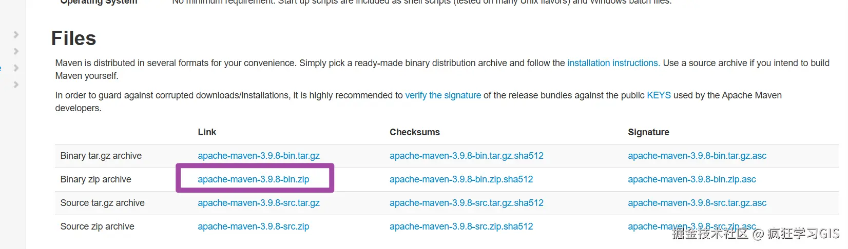 首先,我们进入Maven的官方下载网站,并按照自己电脑的实际情况下载对应的文件。如果是需要给Windows电脑安装,就选择如下图所示的文件即可。