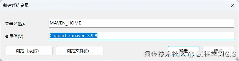 如下图所示,变量名为MAVEN_HOME,变量值就是前述大家复制好的Maven的安装路径,在我这里就是C:\apache-maven-3.9.8,如下图所示。