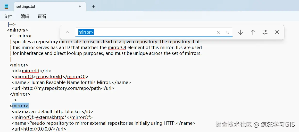 接下来,我们再搜索mirror>,并找到如下图所示的位置。
