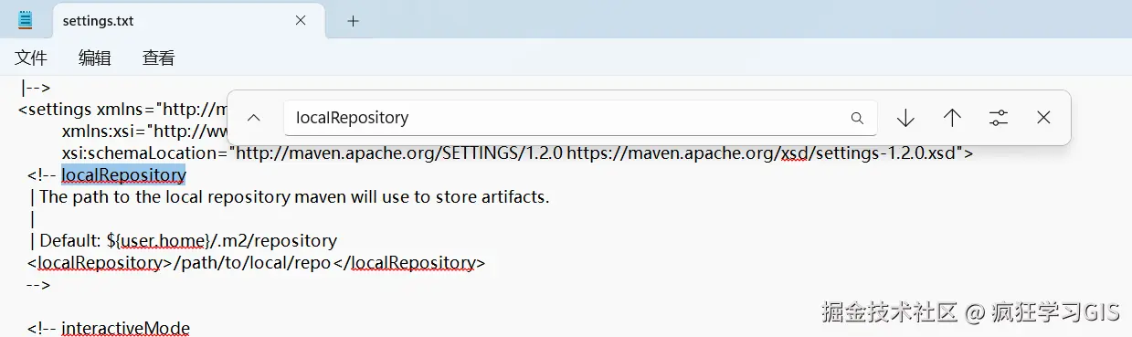 首先,我们在记事本中搜索localRepository这个关键字,然后找到如下图所示的位置。