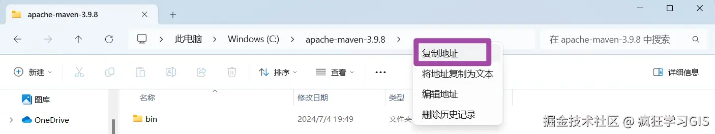 随后,将压缩包解压到某一个目录中,建议放在一个简短的路径中;这个路径相当于就是后续Maven的安装路径,如下图所示。随后,复制一下这个路径。