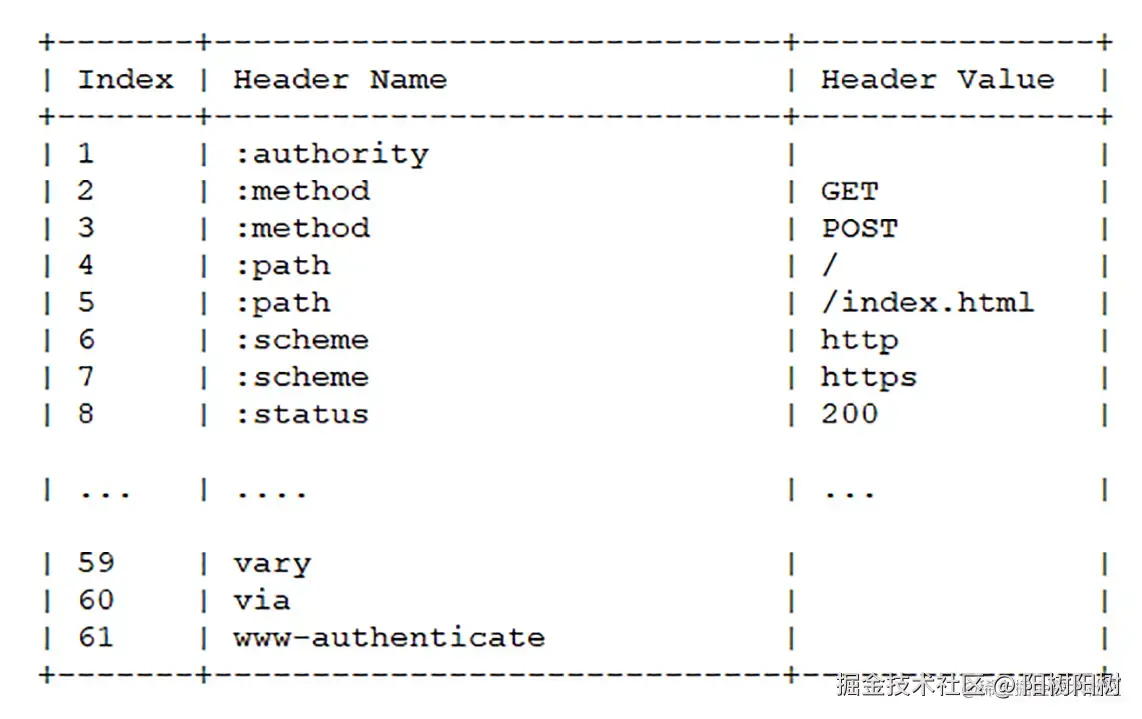 - 首先是在服务器和客户端之间建立哈希表,将用到的字段存放在这张表中,那么在传输的时候对于之前出现过的值,只需要把索引(比如0,1,2,...)传给对方即可,对方拿到索引查表就行了。这种传索引的方式,可以说让请求头字段得到极大程度的精简和复用。