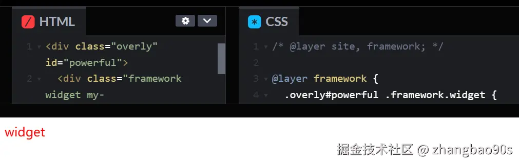 这段代码通过 @layer 将针对同一个元素的样式规则划分到了两个不同的层 framework 和 site 中。按照 @layer 的优先级规则,后声明的层优先级更高——也就是说,先看层级顺序,再看同层级内的权重。
