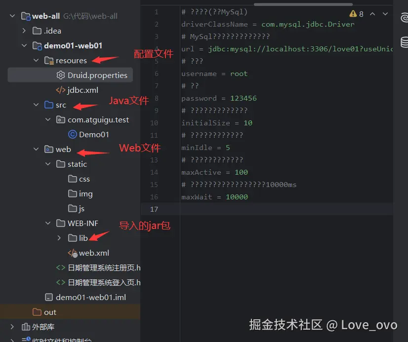 java代码放在src文件中。 html、css、js 放在web文件中。