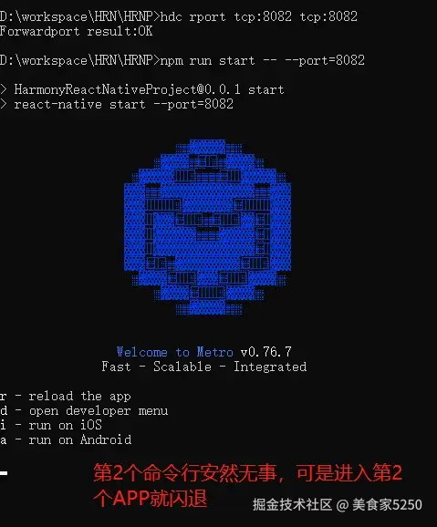 你会发现第2个APP打开的时候会闪退,并且闪退的日志没在第一个命令行窗口里,而是跑到了第1个项目的窗口中了。这里有2种改法,改起来其实很简单: