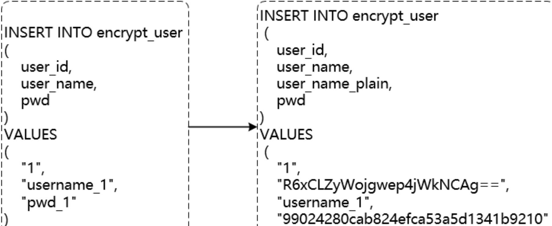 这过程,ShardingSphere会把原SQL语句转换为用于数据脱敏的目标语句: